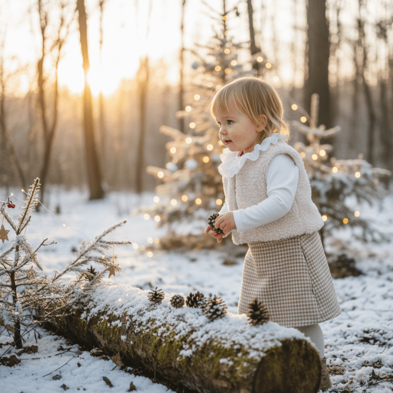 De stof is bijzonder: een rijke mix van 70% polyester, 10% scheerwol, 10% merinowol en 10% gemetalliseerd polyester. Dankzij dat laatste ingrediënt krijgt het rokje een subtiel glimmertje dat net opvalt als het licht erop valt. Perfect voor feestjes, familiefeesten of een winterse fotoshoot. Warm, soepel én feestelijk in één.