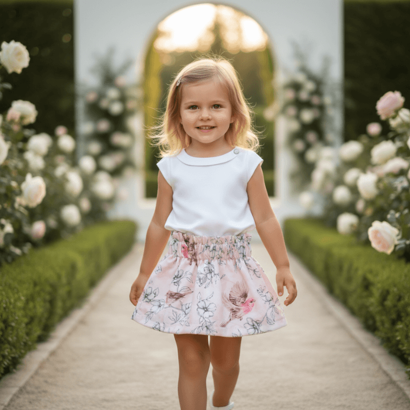 Dit meisjes paperbag rokje van katoen met goudvink print is een bijzonder en sfeervol item uit de feestcollectie van Boetiek Uniek. Een rokje dat meteen in het oog springt door de zachte kleuren, de verfijnde bloemenprint en natuurlijk de prachtige goudvinkjes. Perfect voor een feestje of een bruiloft waarbij meisjes er feestelijk, maar ook comfortabel uit mogen zien.