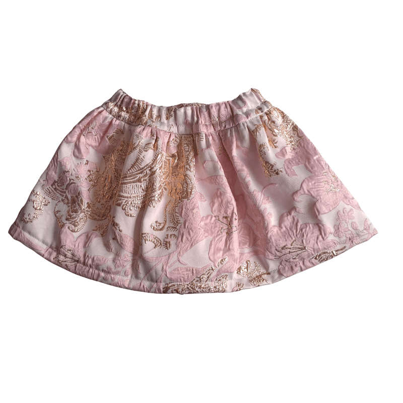 Luxe Chiz-Chic meisjes feestrok van jacquard in roze met gouden accenten. De stevige stof en satijnen onderrok met crinoline zorgen voor een prachtig wijd silhouet.