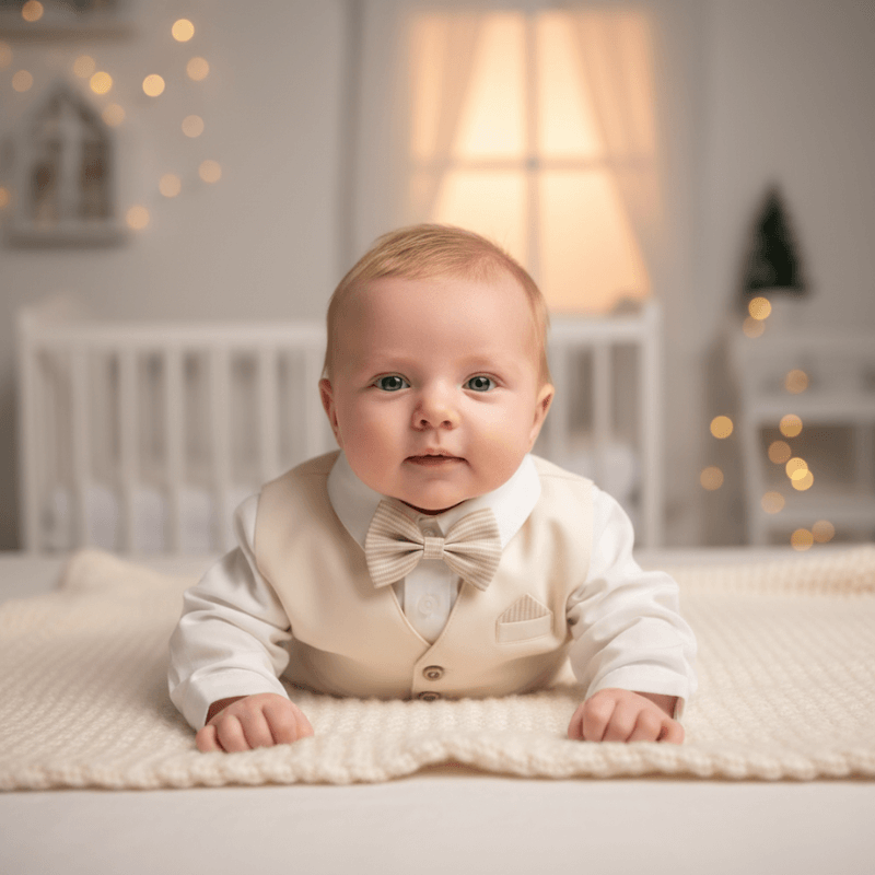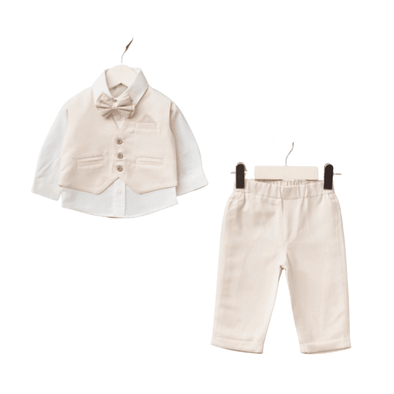 Stijlvol én comfortabel: dit dooppakje voor jongens is een complete vierdelige set van 100% katoen, perfect voor dopen en speciale momenten. Inclusief overhemd, vest, vlinderdas en broek. Een feestelijke look waar je kleine man in straalt!