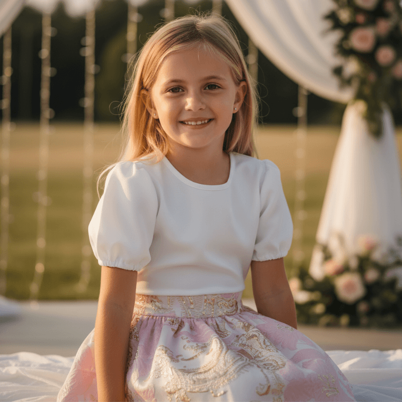 Deze meisjes kinderblouse is onderdeel van feestcollectie kleding voor kinderen die als daggast bij een bruiloft aanwezig zijn. De blouse straalt stijl en zachtheid uit, zonder overdreven te zijn. Daardoor is hij niet alleen geschikt voor bruiloften, maar ook voor andere feestelijke gelegenheden zoals een doop, verjaardag of familiebijeenkomst.