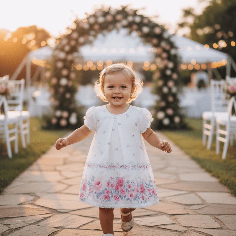 Soms heb je van die babyjurkjes waar je ogen naar toe worden getrokken. Dit is zo’n jurkje. Heel lief met die mooie bloemen in pastel kleuren. Mooie pofmouwtjes en een sluiting op de rug.