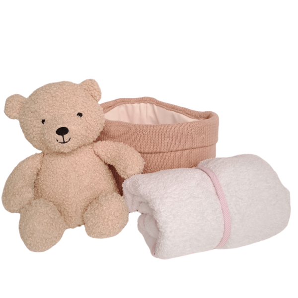 - Materiaal: 100% polyester (Jollein knuffelbeer), 100% katoen (badjas en mandje)