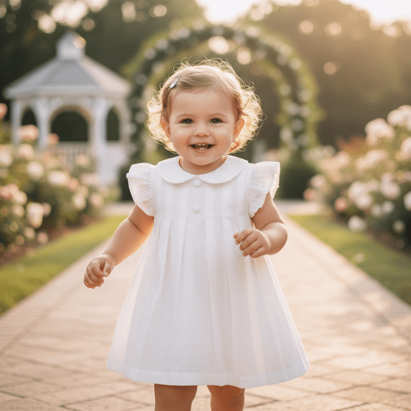Klassiek wit babyjurkje met subtiele bloemenstructuur, Peter Pan-kraagje, sierknoopjes, roezelmouwen en plooien. Perfect voor feestjes en fotoshoots!