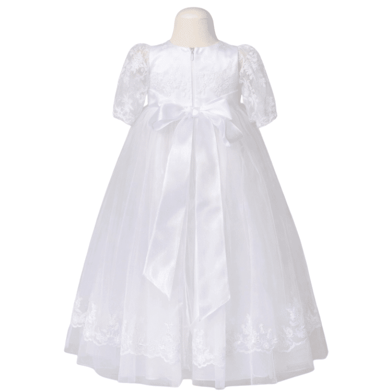 Elegante lange doopjurk voor babymeisjes met kanten lijfje, rechte mouwen en sierlijke strik achterop. Perfect voor een stijlvol doopmoment vol betekenis en traditie.