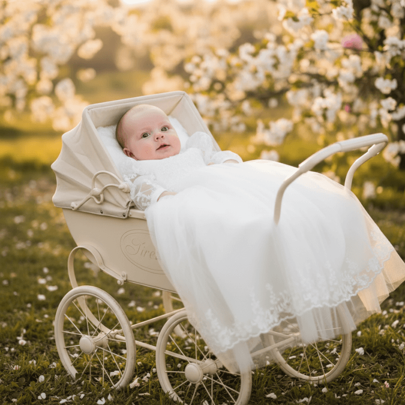 Deze lange doopjurk is niet alleen een outfit, maar een blijvende herinnering – en misschien zelfs een familiestuk dat doorgegeven wordt van generatie op generatie.