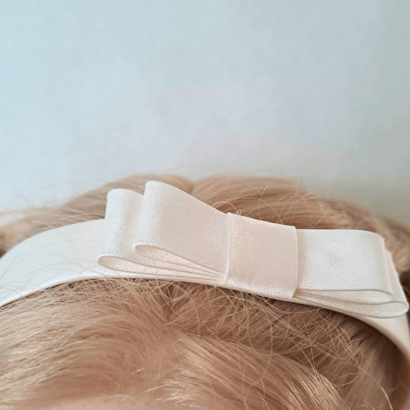 Elegante baby haarband van offwhite bruidssatijn met dubbele strik en elastiek. Perfect voor doop, feest of als haaraccessoire voor bruidsmeisjes.