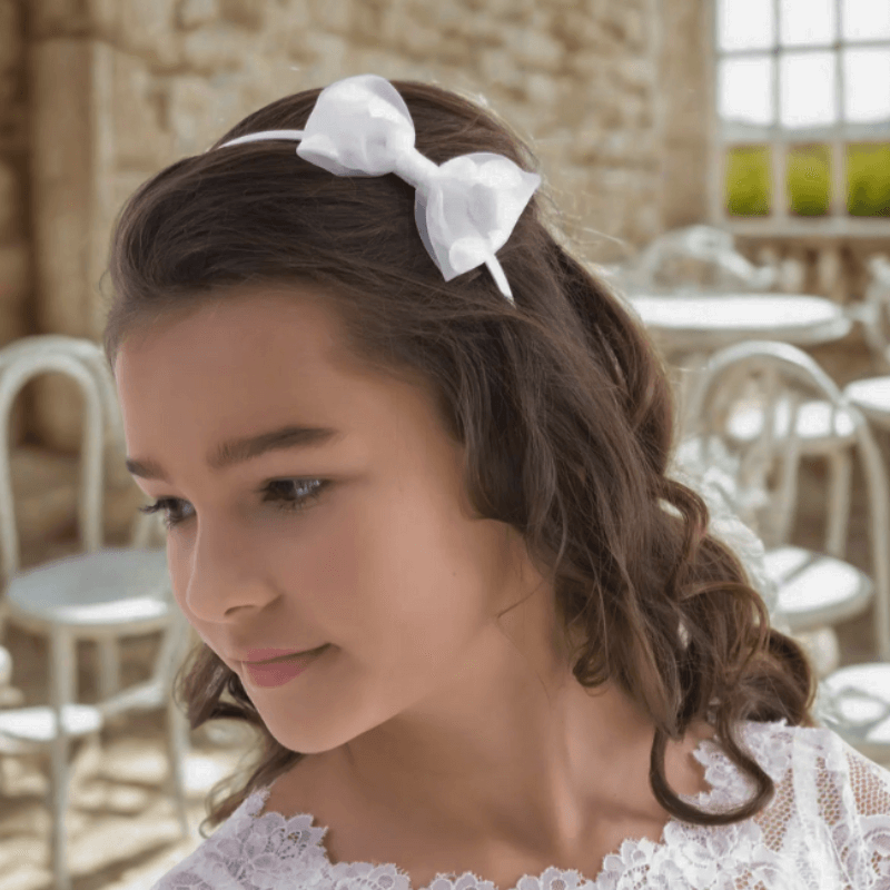 Stevige luxe meisjes diadeem bekleed met ivoor kleurig satijn en afgewerkt met een organza strik. Zonder tanden, geschikt vanaf 3 jaar. Perfect voor communie of bruiloft.