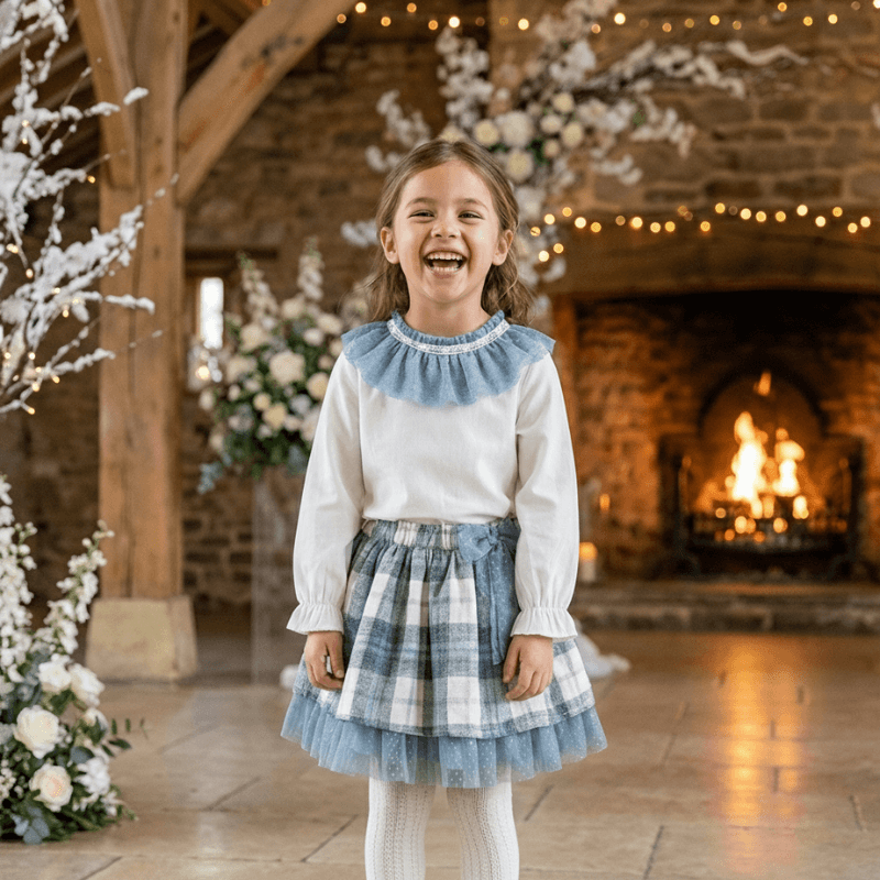 Klassieke crème kleurige meisjes blouse met blauwe tule kraag