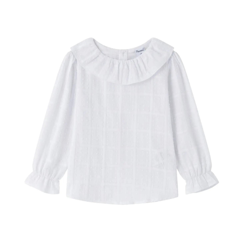 Deze meisjes blouse met lange mouw is van het Spaanse merk Newness en heeft eigenlijk wel een tijdloze uitstraling. Vroeger werden deze blouses al gedragen en nu ook nog steeds. Het is een kinderblouse dat het hele jaar gedragen kan worden. Het is van dunne katoenen stof. Dat is zeker niet te warm in de zomer en voor in de winter of het najaar kan je er een vestje overheen doen.